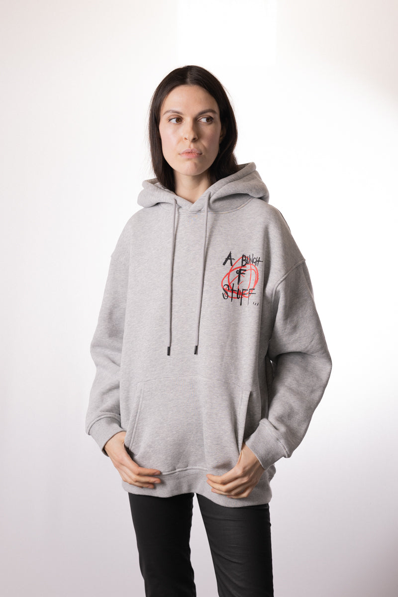 このグレーのマールフーディーには、ジョニー・デップのオリジナルスケッチを基にした「A Bunch Of Stuff」展のロゴが背面に大きくプリントされています。またジョニー自身の名を冠したバニーマンなどのスケッチもデザインされています。