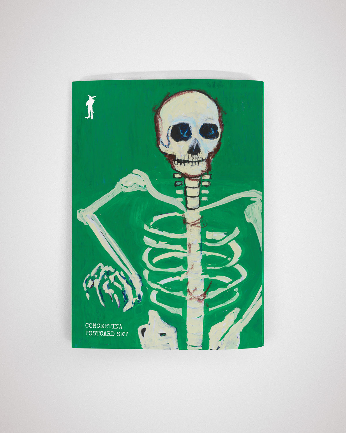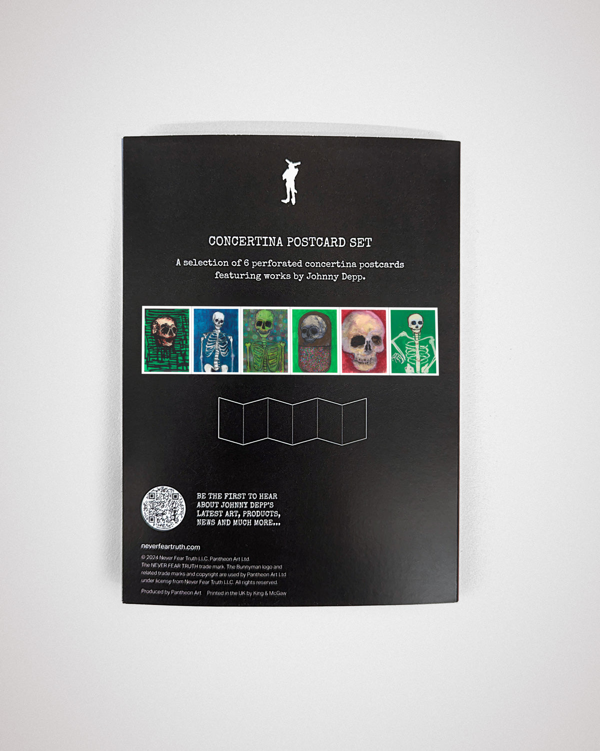 この6枚の蛇腹式カードからは、病的な好奇心、ダークユーモア、そして魂の探求が、青、赤、緑などの鮮やかな色彩と共に溢れ出ています。