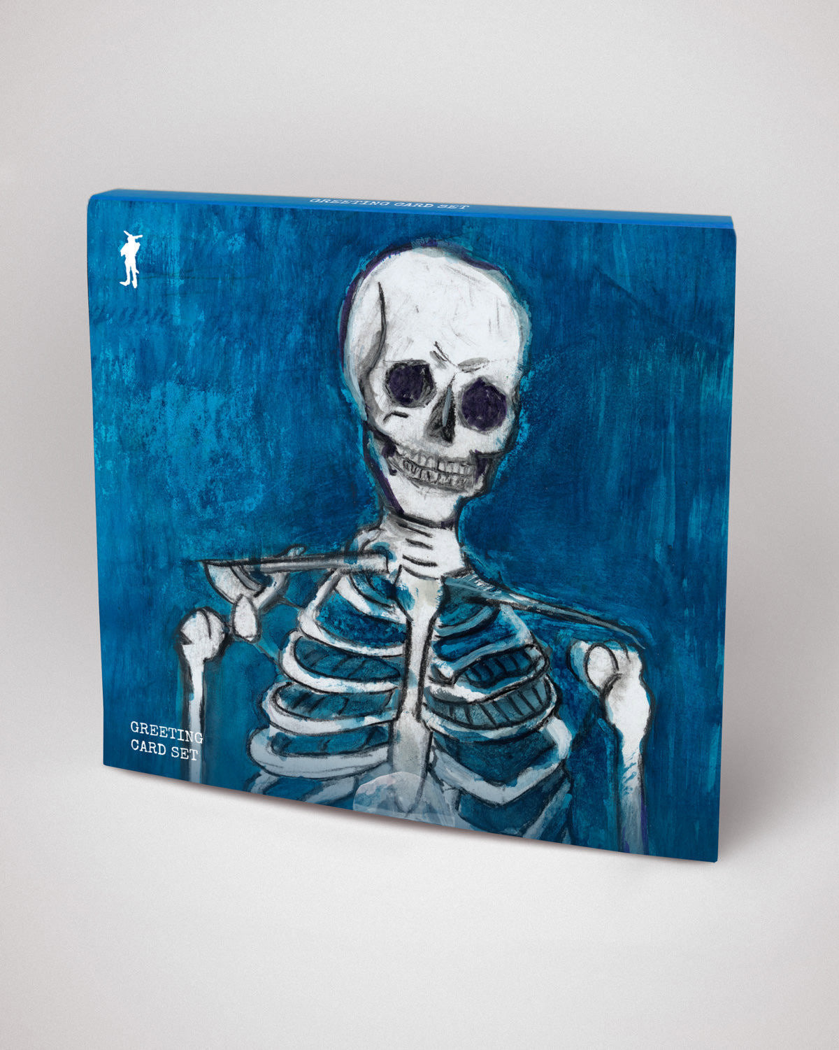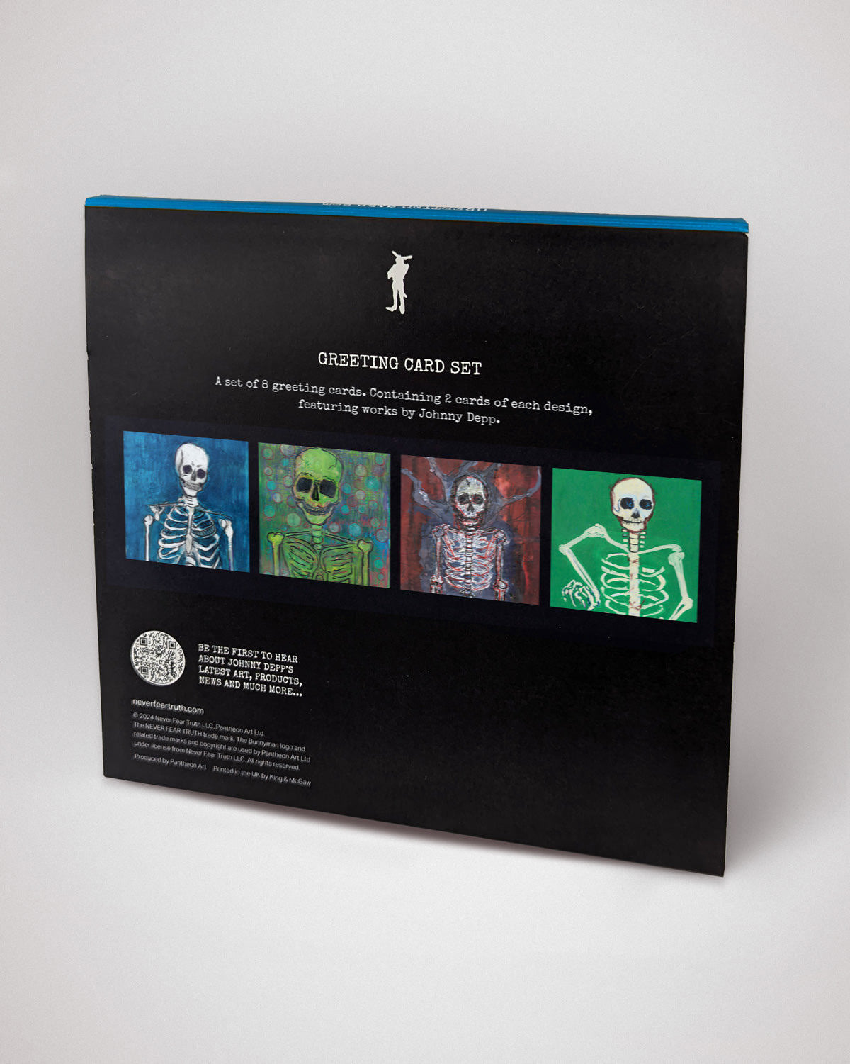 このグリーティングカードセットからは、病的な好奇心、ダークユーモア、そして魂の探求が、青、赤、緑などの鮮やかな色彩と共に溢れ出ています。例えば『Death by Confetti』のような非現実的なシュルレアリスティックなポートレートには、強烈なネオン、コバルト、ブラックが縦横無尽に駆け巡り、「有名人とは何か、公の目に晒されて注目されて生きるとはどういうことか」をユーモラスに、それでいて鋭く捉えられています。ジョニーらしく、これらの感情をコメディアン的な視点で捉え、骨や脊椎をネオンカラーと対比させることで、ハリウッドの極端な浮き沈みを表現しています。