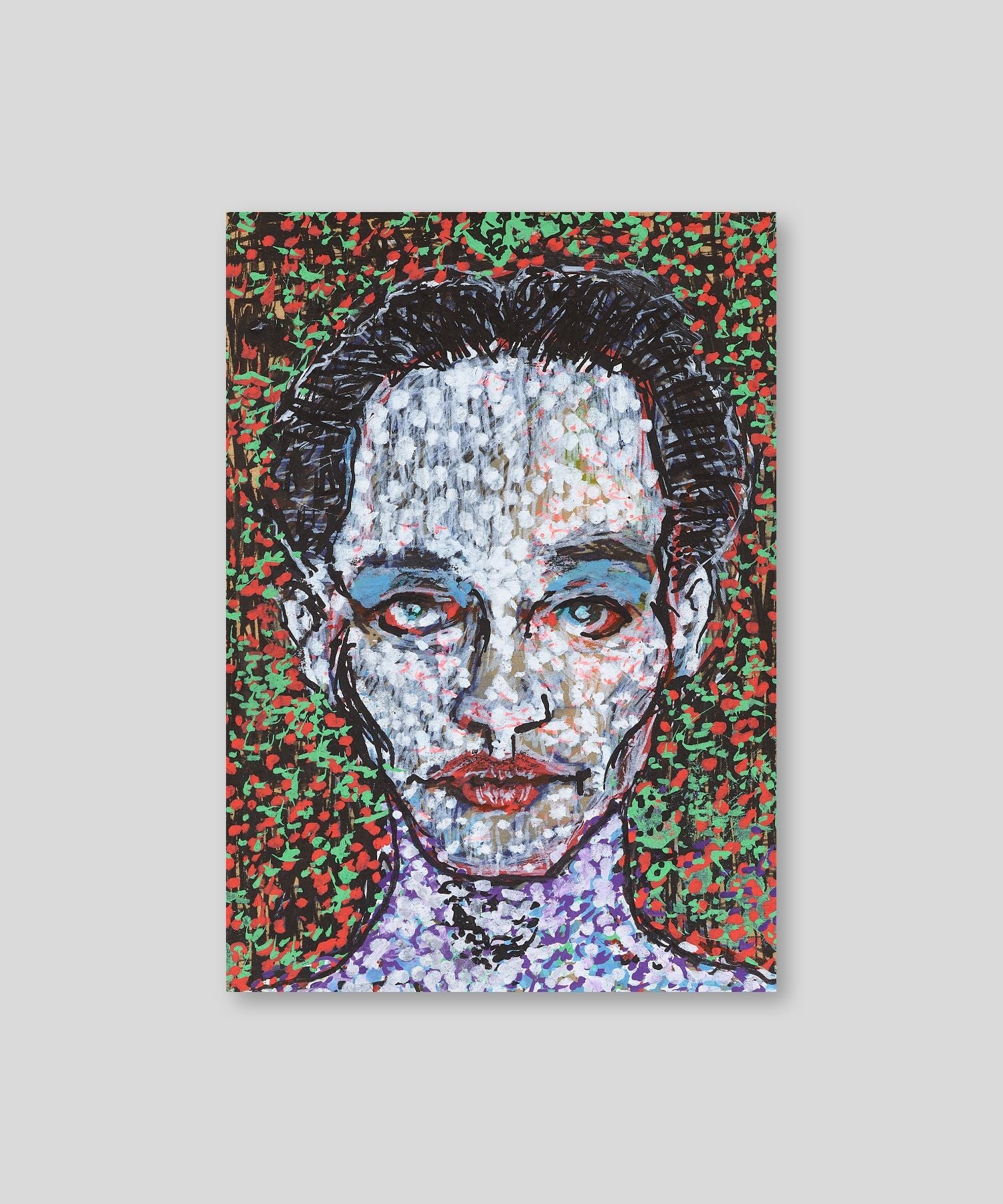 この肖像画は、紙吹雪のような点描と鋭角的なディテールが特徴です。ジョニー・デップの精密でありながら実験的な技法が光る作品です。2022年のジョニー・デップのアートワークを基にしています。